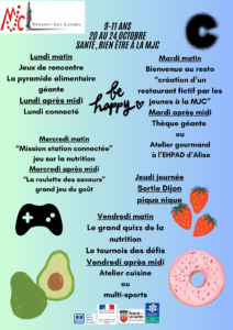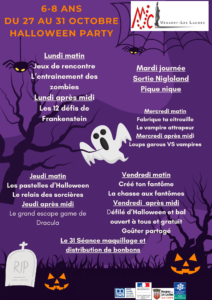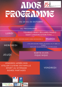 – les vacances scolaires (toutes les vacances hors vacances de noël et l’été ouverture les 5 premières semaines) pour les collégiens et plus l’après midi de 13h30 à 18h avec soirées l’été de 20h à 23h et pour les 3-11 ans de 7h30 à 18h avec possibilité de manger sur place avec repas fourni par la famille (tarif selon QF)