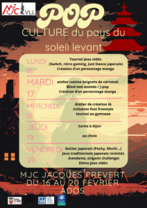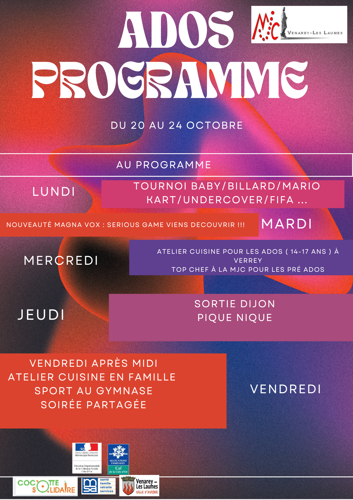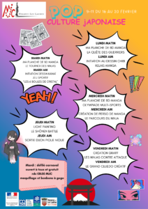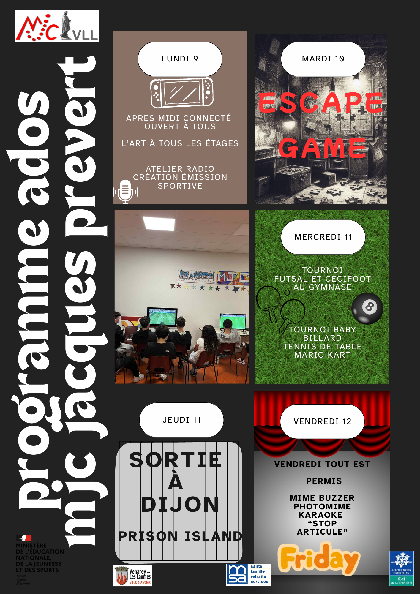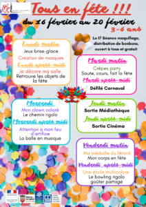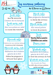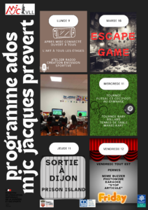 – les vacances scolaires (toutes les vacances hors vacances de noël et l’été ouverture les 5 premières semaines) pour les collégiens et plus l’après midi de 13h30 à 18h avec soirées l’été de 20h à 23h et pour les 3-11 ans de 7h30 à 18h avec possibilité de manger sur place avec repas fourni par la famille (tarif selon QF)